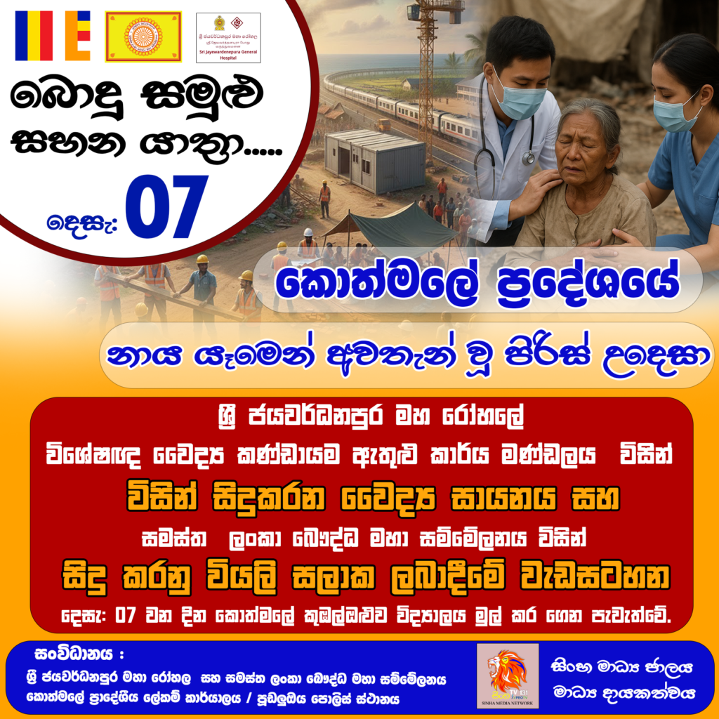 The All Ceylon Buddhist Congress, together with a team of specialist doctors from the Sri Jayewardenepura General Hospital, has organized a medical camp for the villages of Kumbaloluwa and Niyangandora in the Kotmale Divisional Secretariat Division. This medical camp will be conducted by the specialist team of the Sri Jayewardenepura General Hospital on Sunday, 7th December 2025, at 9.30 a.m. in Kotmale. Arrangements have also been made, with the support of the staff of the Sri Jayewardenepura General Hospital, to provide lunch for 500 residents of these villages.